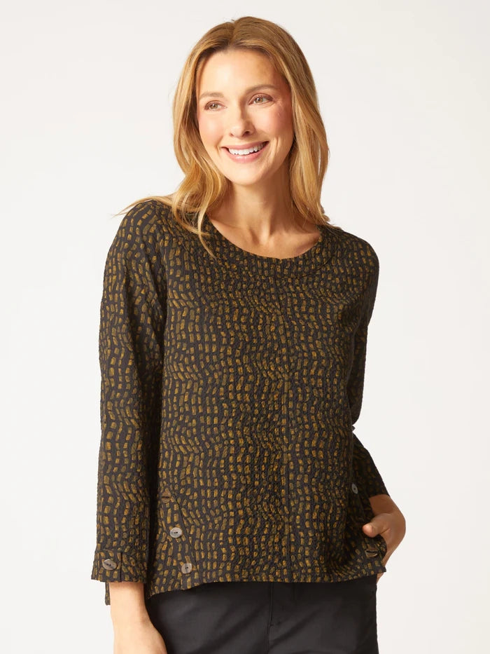 Great details in your favorite travel fabric. Our exclusive mosaic print pops in our button detail pullover.