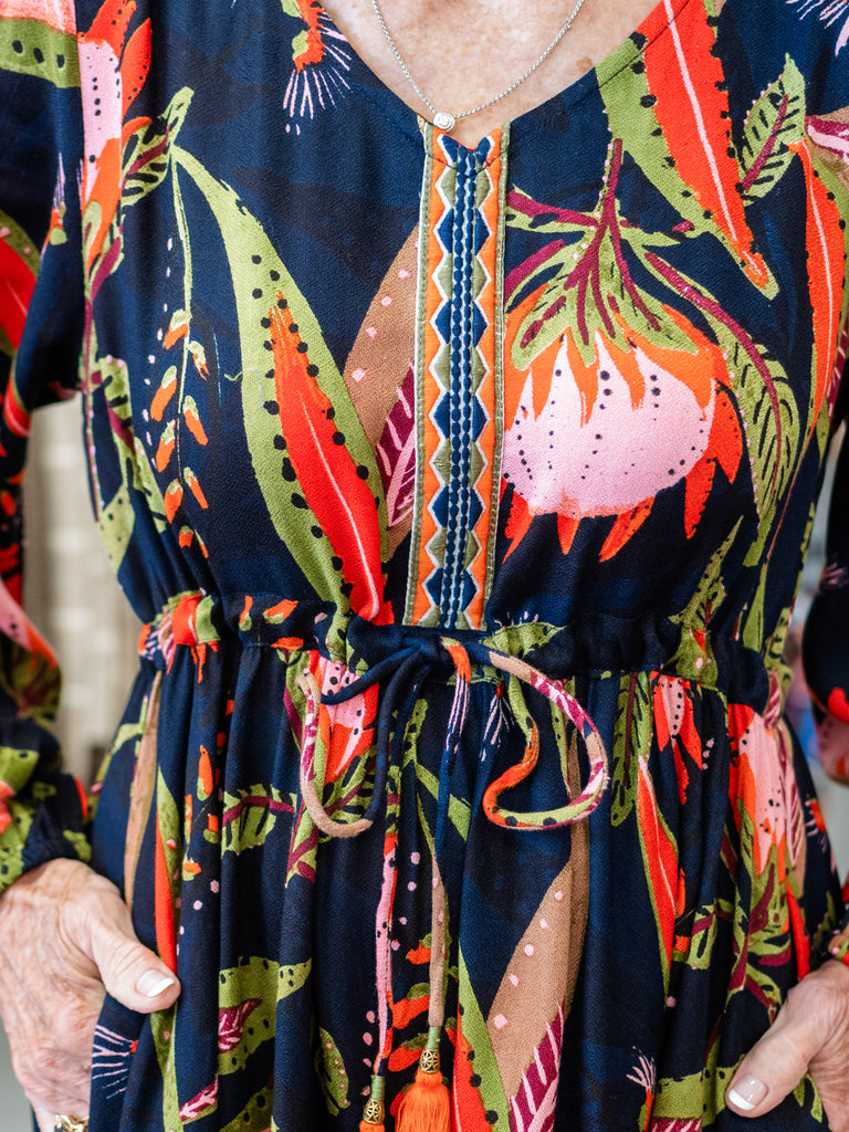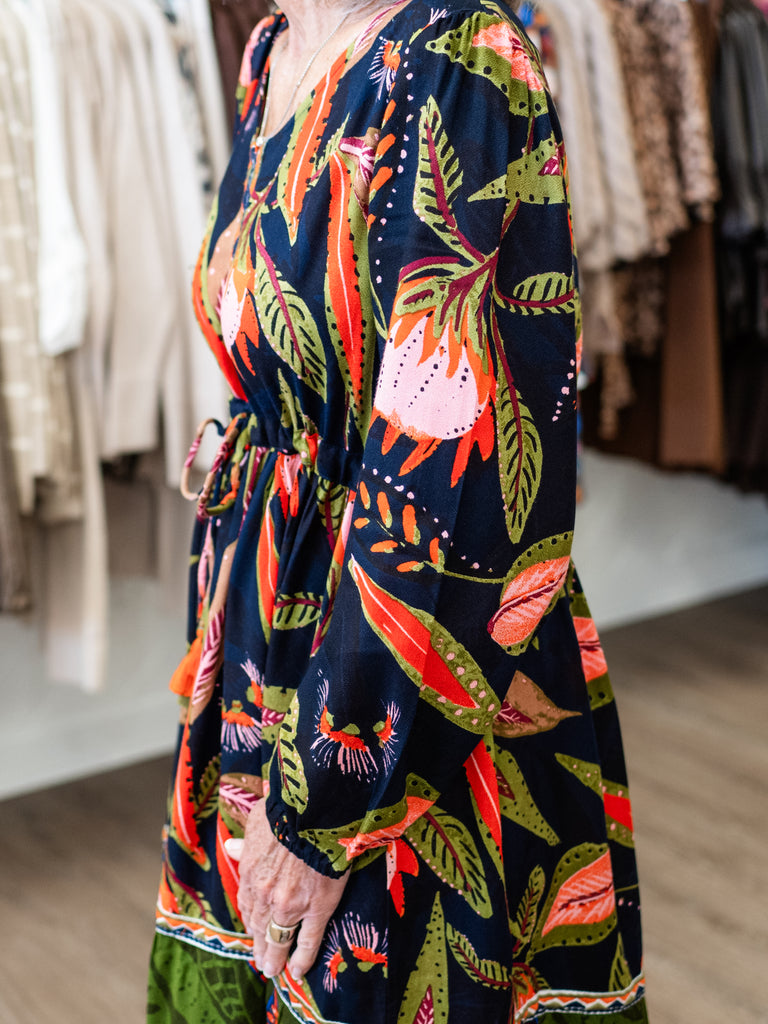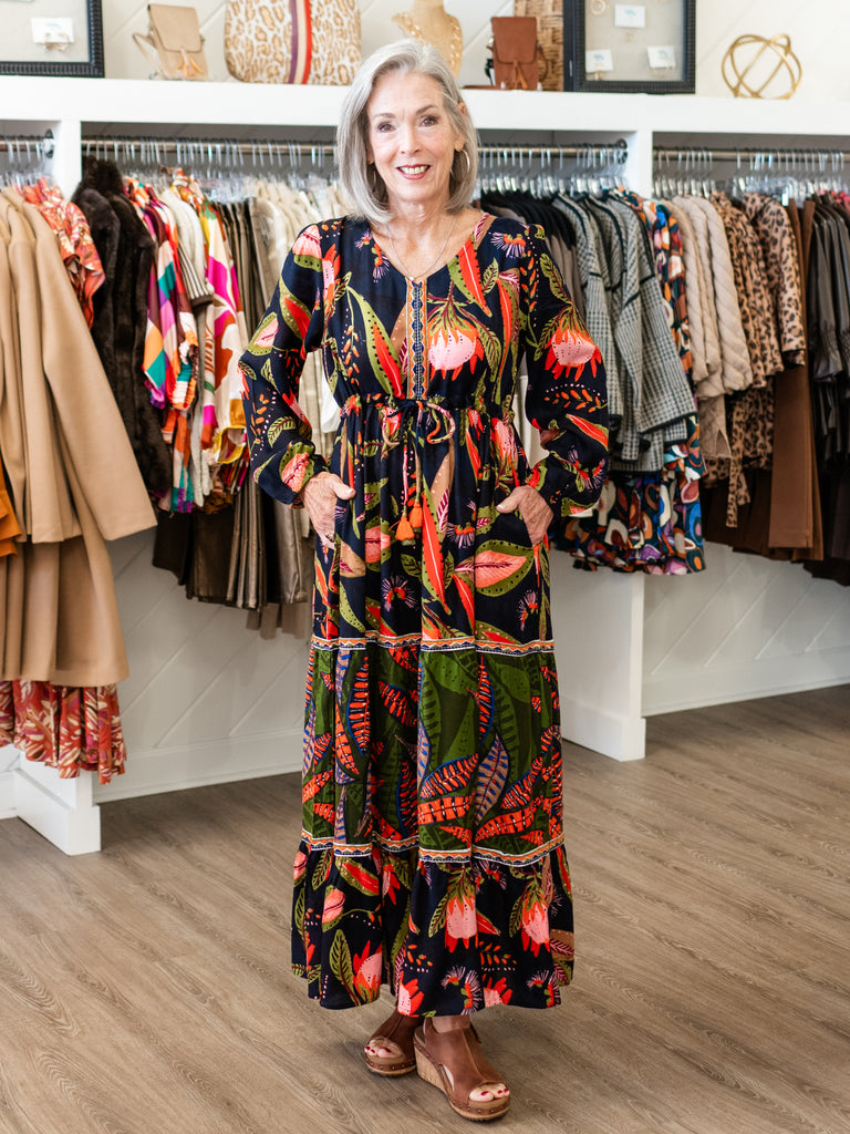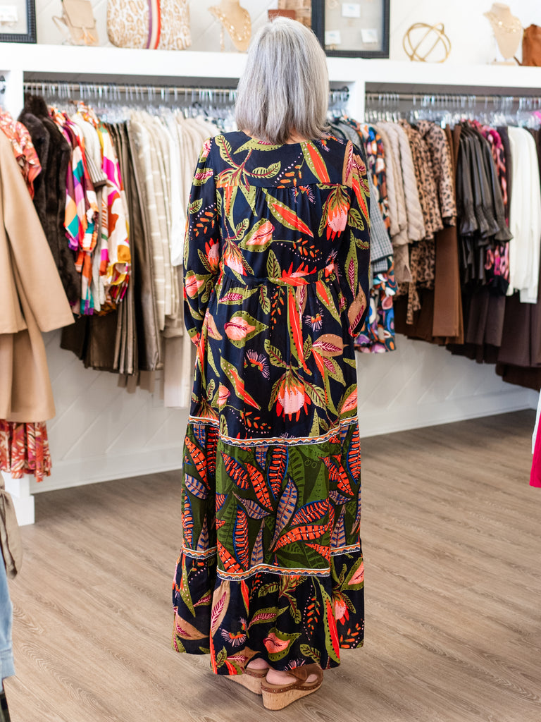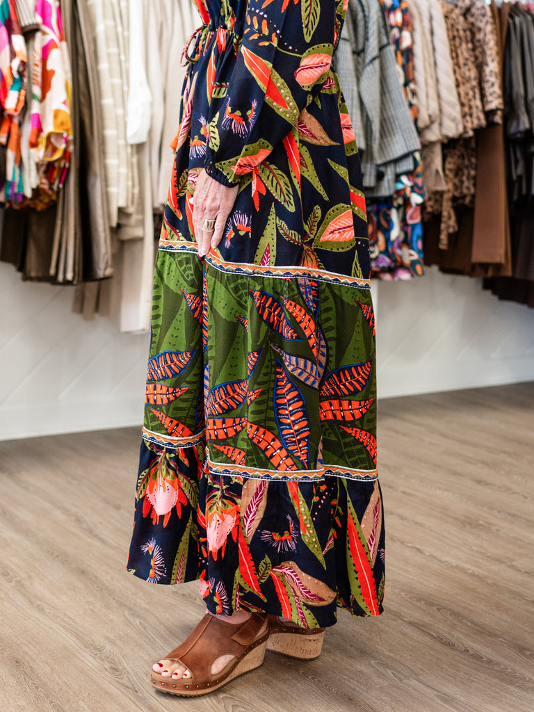 This stunning maxi dress from Orientique is designed to flatter every figure. Crafted from soft, breathable 100% rayon, it features a feminine V-neckline, long sleeves, and a tiered skirt for graceful movement. The adjustable drawstring waist creates a defined silhouette, while discreet pockets add a touch of practicality without sacrificing style.
