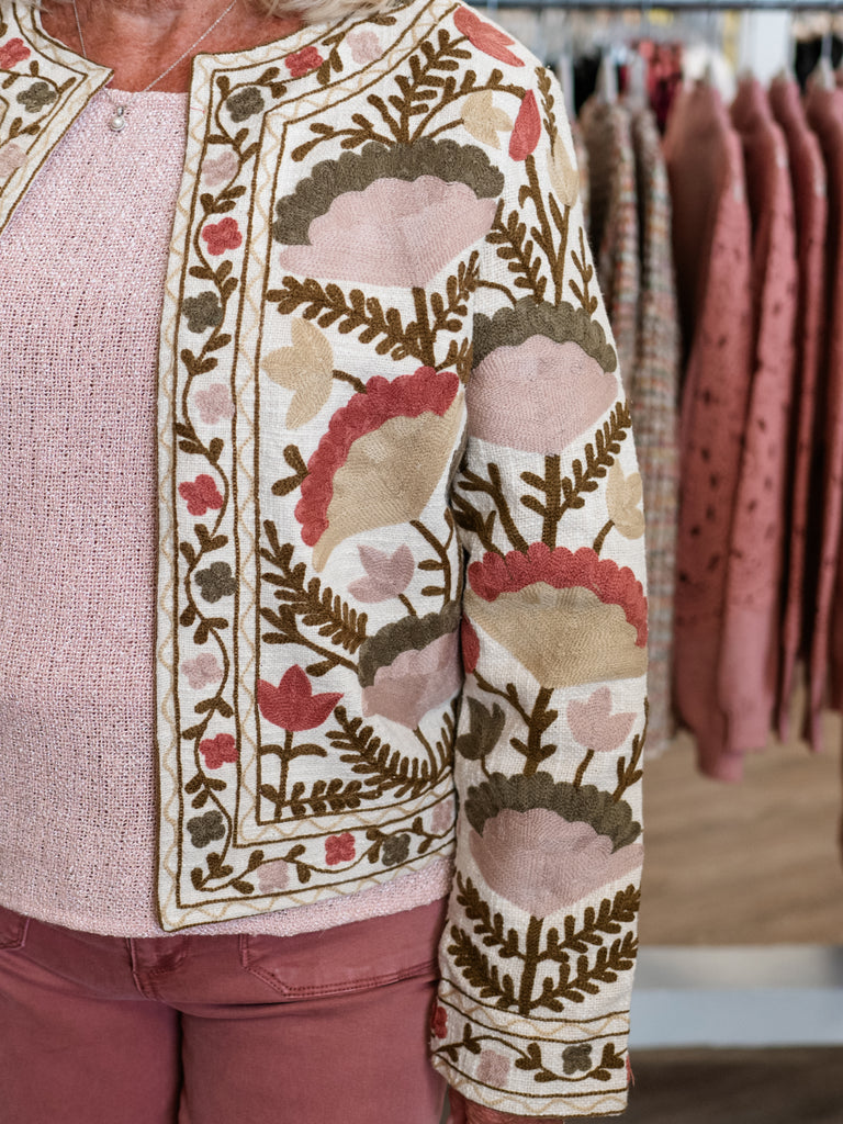 Discover the perfect blend of style and comfort with our edge-to-edge embroidered set-in sleeve jacket.  This unique piece features exquisite embroiderey that elevates the classic jacket design, adding a touch of artistry to your wardrobe.  This jacket is a statement piece that brings sophistication and charm to any look.