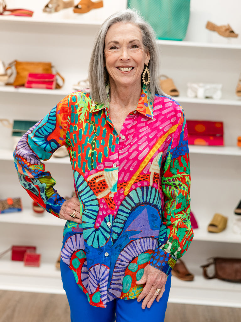 Make a bold statement with this vibrant blouse by Claire Desjardins, where fashion meets fine art. Featuring a colorful abstract print inspired by the artist’s original paintings, this blouse showcases a striking mix of fuchsia, turquoise, coral, blue, and green for a look that is both playful and sophisticated.