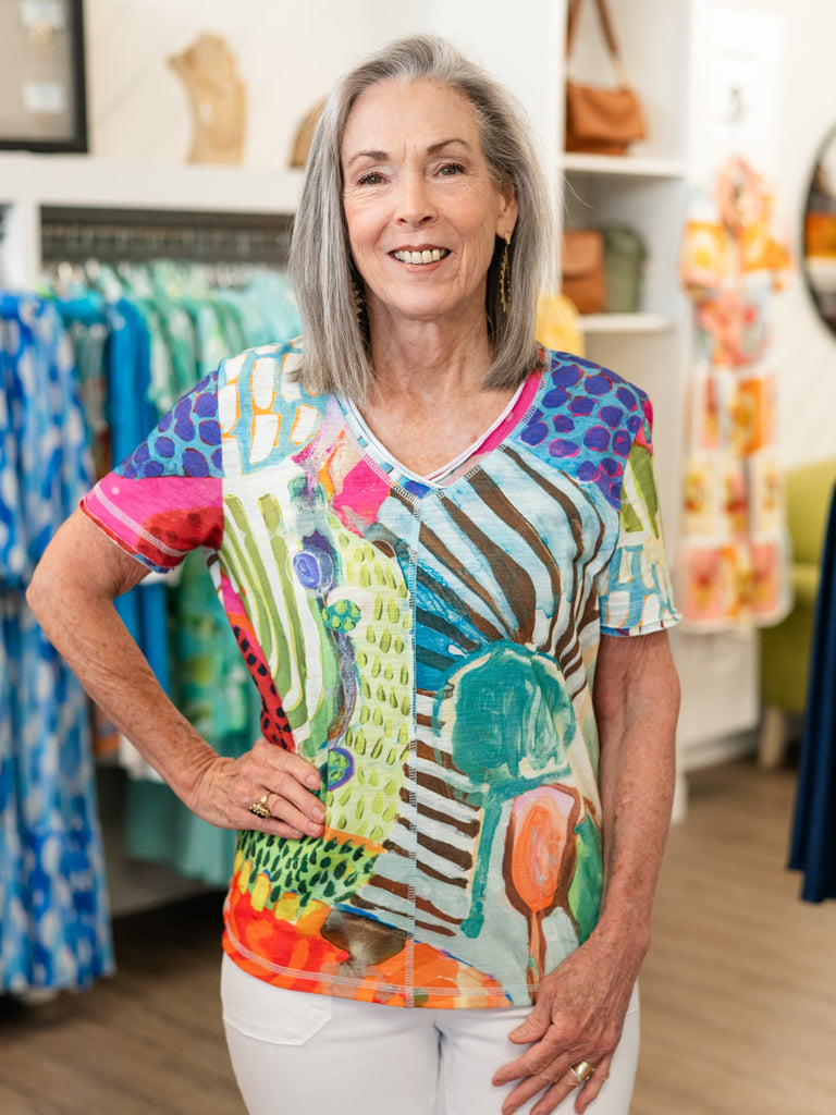 Add a touch of wearable art to your everyday wardrobe with this vibrant short sleeve top by Claire Desjardins. Featuring a colorful abstract print inspired by the artist’s original paintings, this top blends shades of turquoise, coral, pink, lime, and soft neutrals for a look that is both playful and sophisticated.
