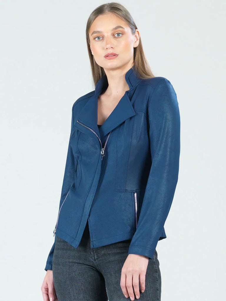 Let our faux Liquid Leather Signature Jacket pour all over you as it is made from our beautiful signature stretch knit, extremely lightweight soft "lambskin feel" fabric with a soft matte finish. This jacket features a notched lapel with upright collar, long sleeves, silver a-symmetrical zip closure, faux pocket zipper slits as well as complimentary detailed front and backstitching.