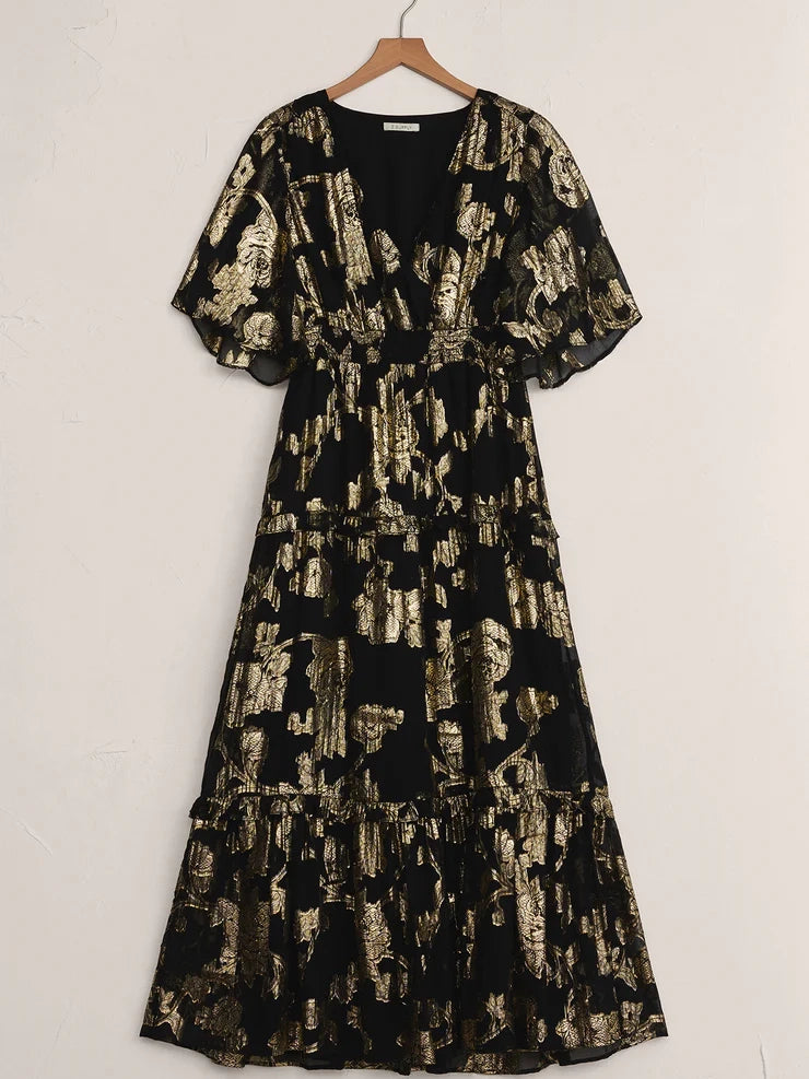 A romantic jacquard fabric and allover floral motif define this elegant maxi. Finished with a v-neck and soft drape, it’s made for special occasions.