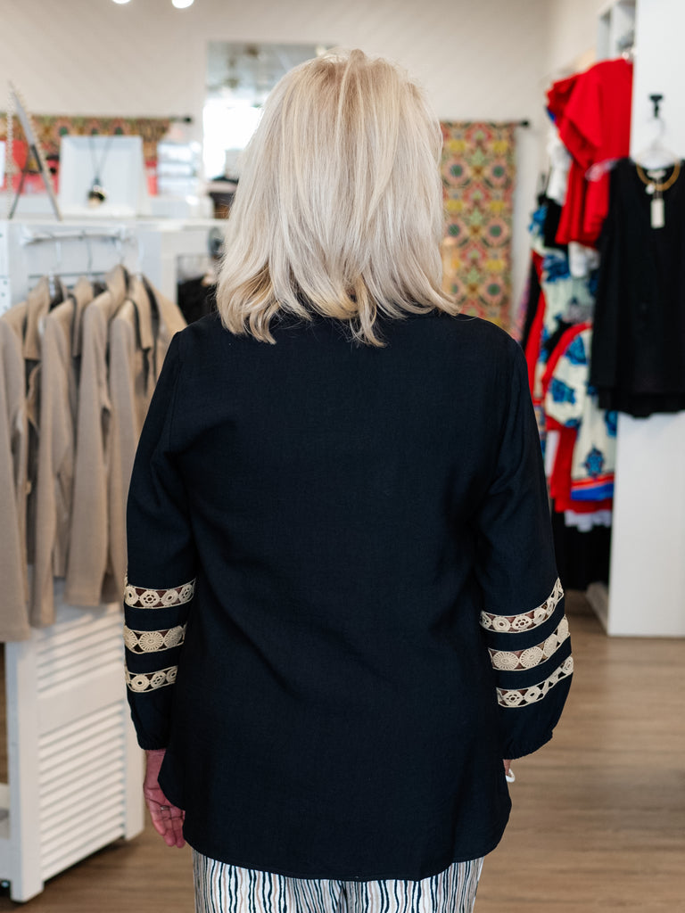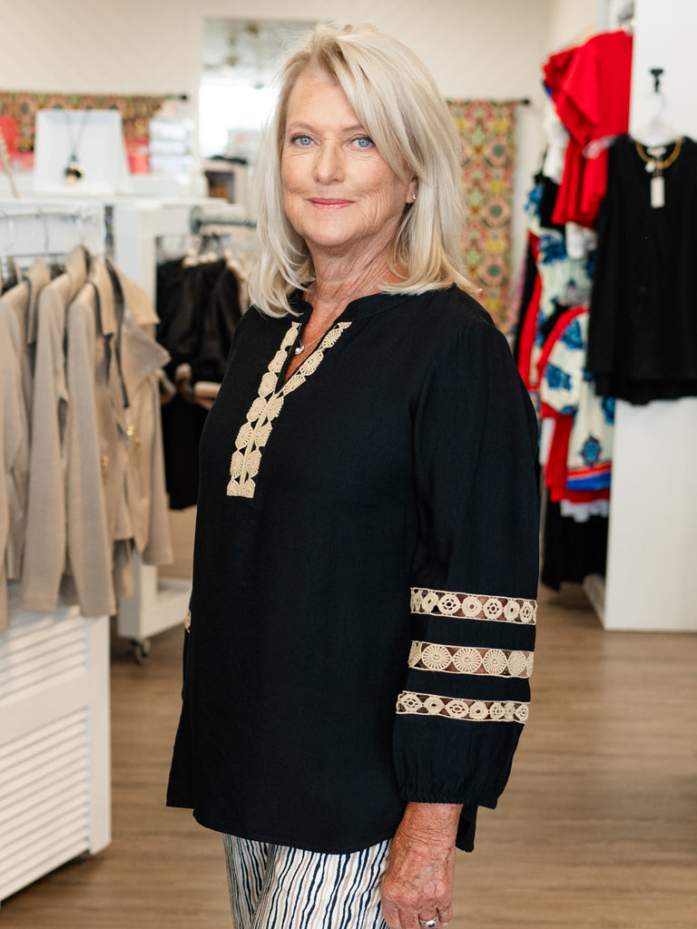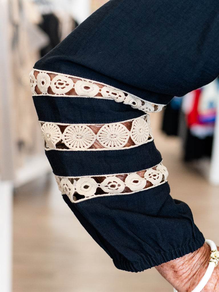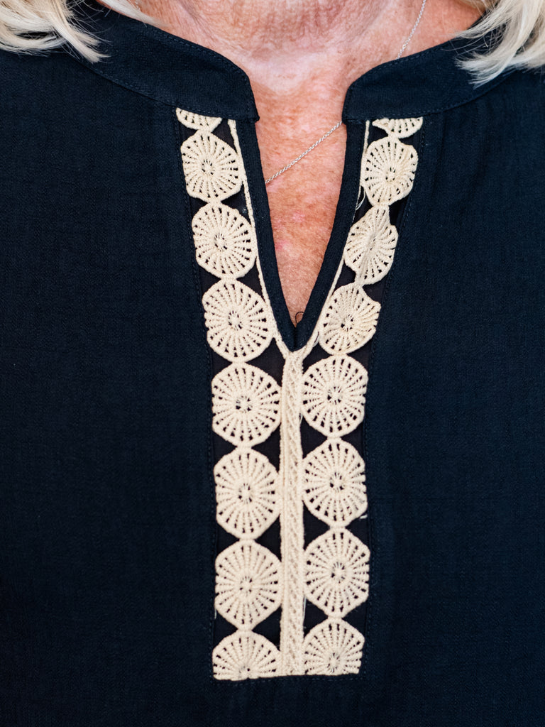 Add a touch of elegance to your wardrobe with our lace trim notch v-neck top, designed with flattering 3/4 sleeves. This beautiful top features a delicate lace trim that enhances the v-neckline, creating a sophisticated yet feminine look. Pair it with tailored trousers or a skirt for a polished ensemble, or dress it down with jeans for a chic, everyday outfit.