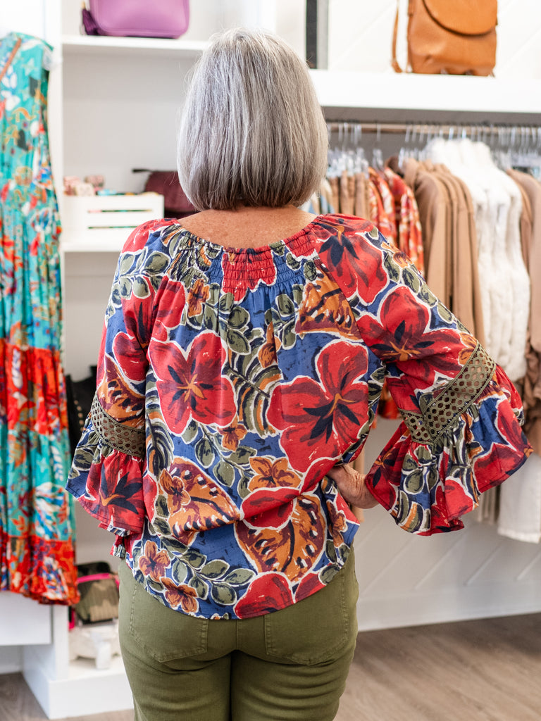 Effortlessly breezy and full of movement, this crinkle woven top features a romantic shirred neckline and soft flounce raglan sleeves. The lightweight slub fabric brings texture to the vibrant print, making it the perfect blend of relaxed and refined.