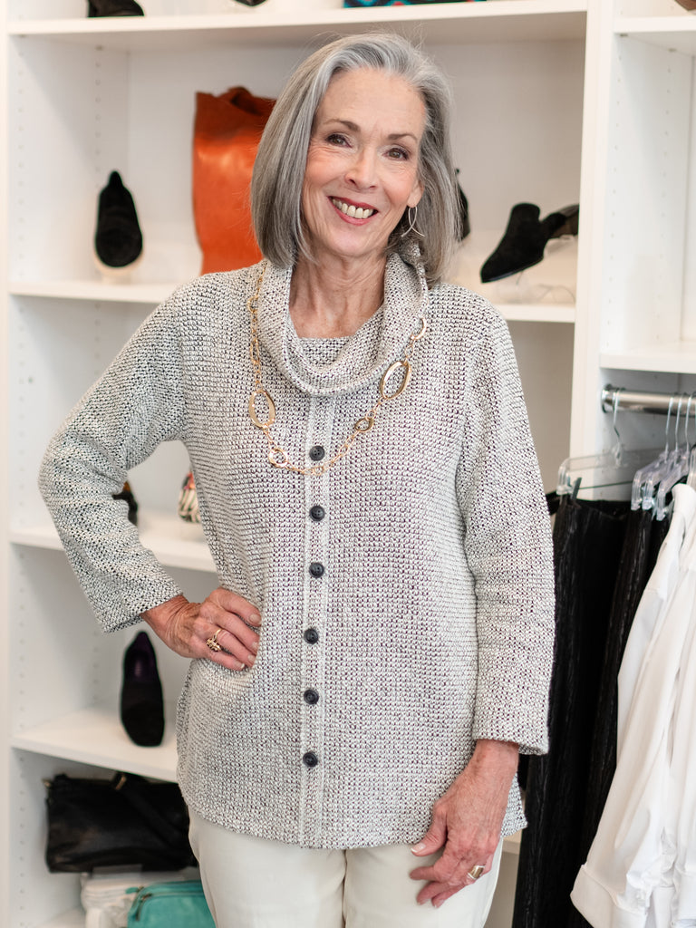 This women's 3/4-sleeve cowl-neck top blends effortless style with all-day comfort. Crafted from soft, beautifully draped fabric, it features a flattering cowl neckline accented with faux button details for a touch of subtle sophistication. Its versatile design transitions seamlessly from casual outings to dressier occasions, keeping you comfortable, confident, and stylish wherever your day takes you.