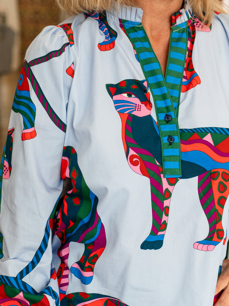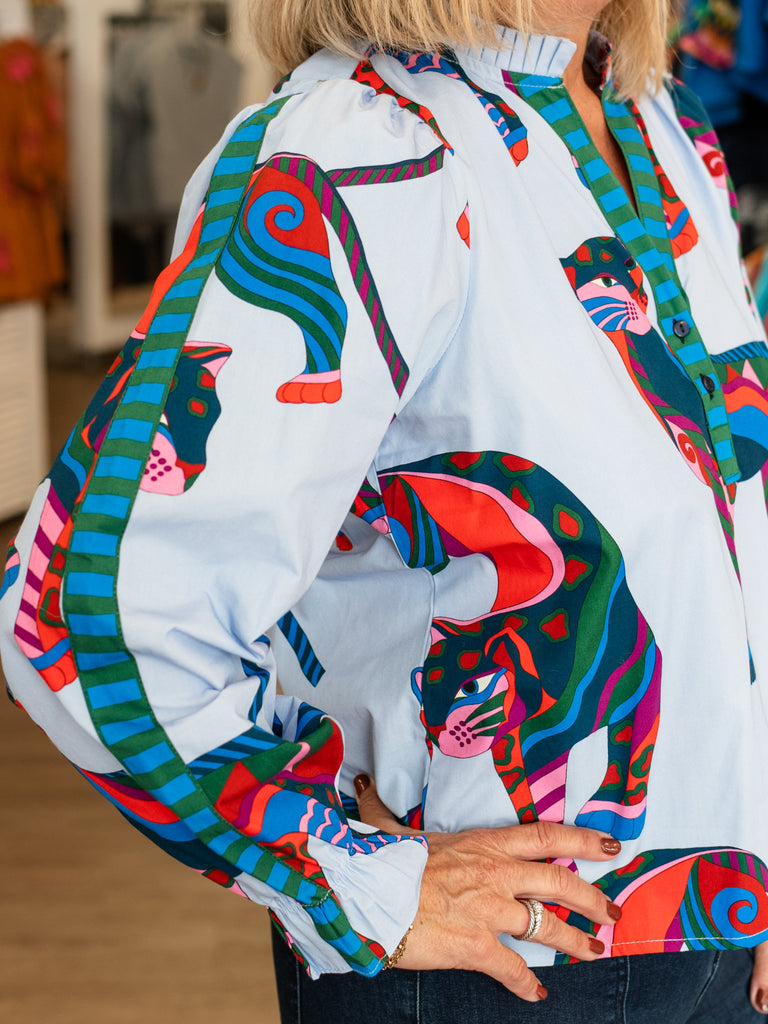 Unleash your wild side in this vibrant blouse featuring a playful safari-inspired print in bold hues of purple, red, and blue. The gathered puff sleeves and split neckline with contrast trim add a chic, tailored touch to this statement top. Lightweight with a flattering silhouette, it pairs perfectly with high-waisted denim for a polished day-to-night look.