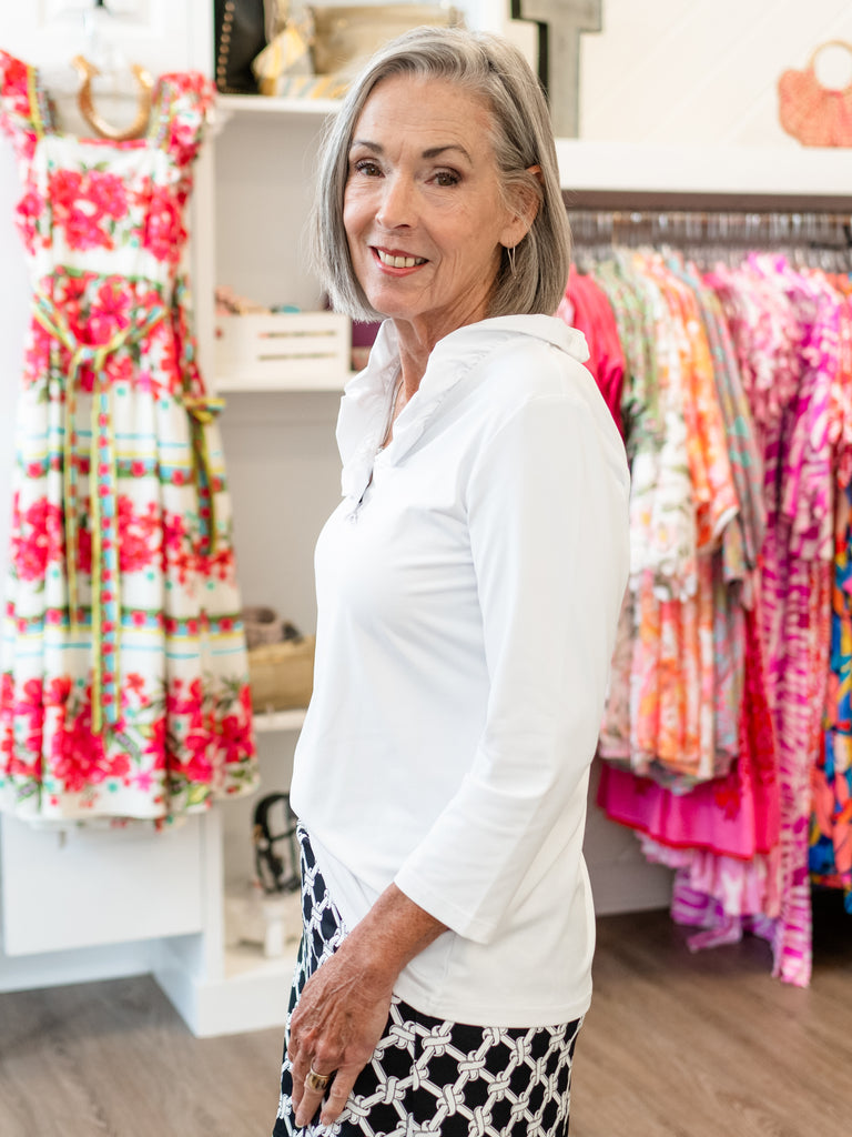 You can't go wrong with a new white top. This new top from Lulu B features 3/4 sleeves, a ruffled collar, and practical preshrunk SPF 50+ material. Pair with your favorite Printed bottom from Lulu B, or go for your favorite denim!