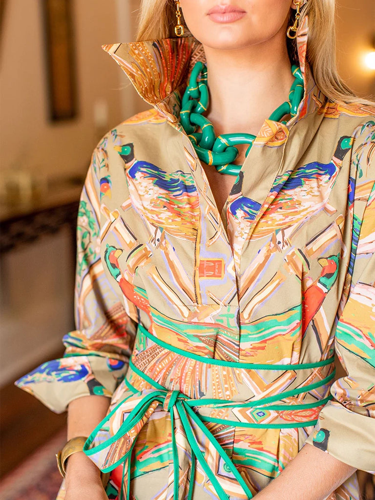 Meet Winston. Winston is a colorful parade of game birds in emerald and gold,decorated with bold red chinoiserie and soft touches of coral on a warm tan