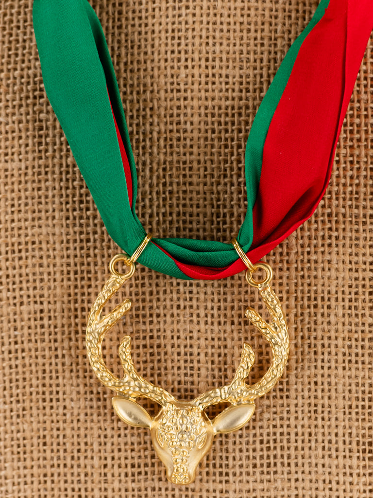 Red & Green Scarf with Gold Reindeer Pendant.