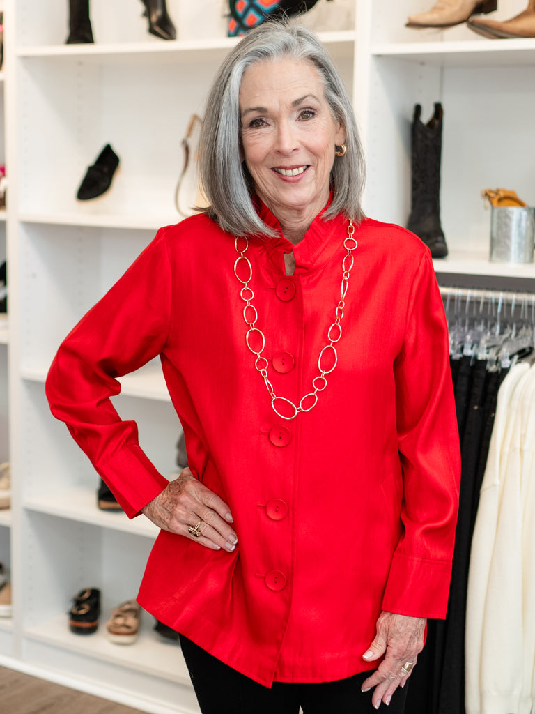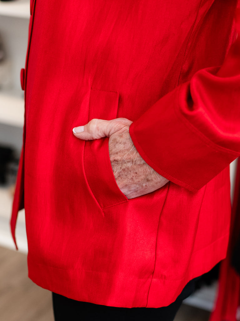 Add a sparkle to your wardrobe with the Shimmer Button Front Jacket! Its playful fit and flare silhouette flatters every curve, while the wire collar lets you shape your style your way. With 3/4 sleeves, button turn-up cuffs, and two handy side pockets, it’s as practical as it is fun. The slightly curved hemline and shimmer woven fabric create a look that shines at every turn. Perfect for layering and turning heads wherever you go!