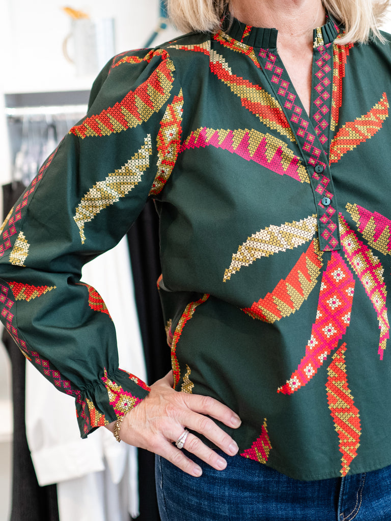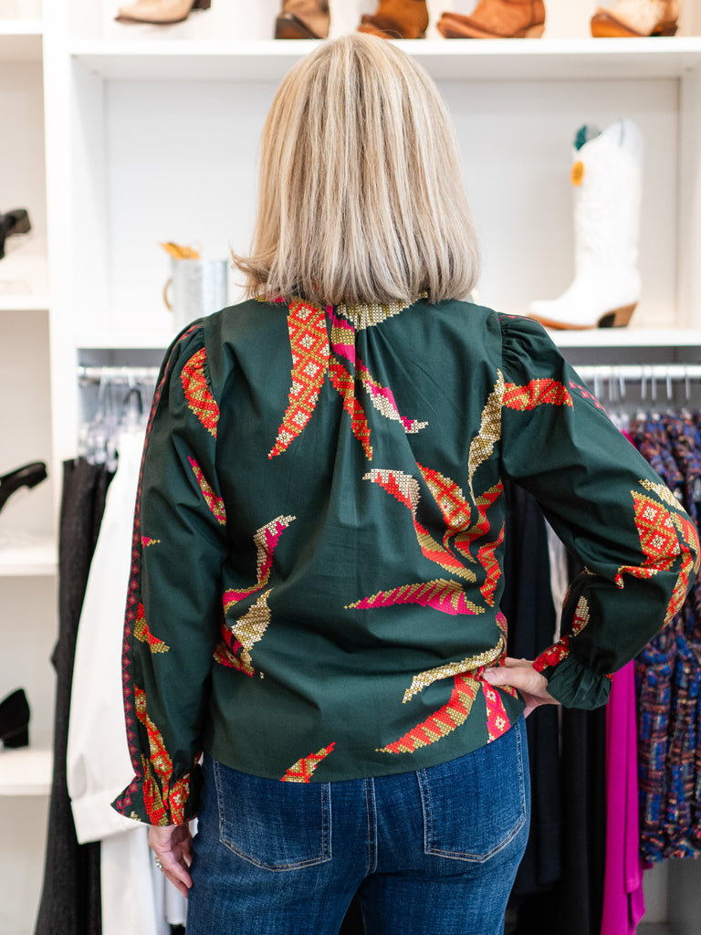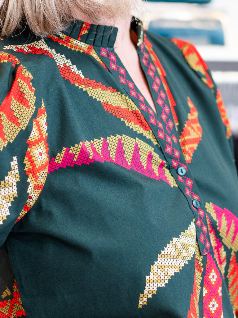 Bring vibrant artistry to your everyday style with this beautiful boho blouse. Set on a rich forest-green background, the top features striking red, gold, and orange motifs arranged in a bold, eye-catching pattern that adds movement and dimension.