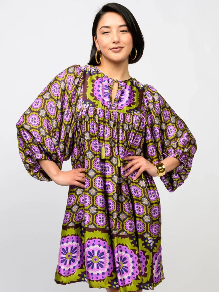 The IVY JANE 73649 Medallion Border Dress showcases a silky medallion design with vibrant patterns, offering a stylish and versatile look. Pair effortlessly with tall boots or wedges for a bold, fashion-forward outfit.