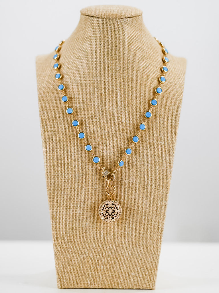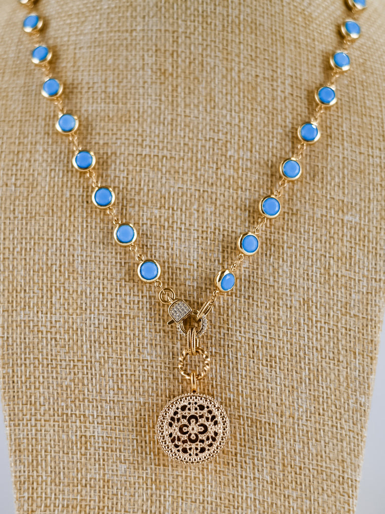 Add a touch of timeless elegance to your look with this stunning blue stone charm necklace. Designed with delicate gold-toned links and evenly spaced vibrant blue stones, this piece brings a perfect balance of color and sophistication. The necklace is finished with a beautifully detailed round charm pendant, creating a graceful focal point that elevates any outfit.