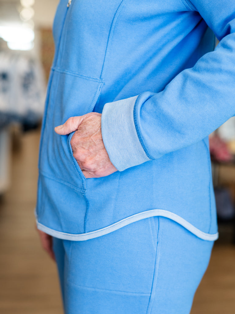 Designed in a beautiful periwinkle blue, this jacket pairs perfectly with coordinating pants for a pulled-together look or with denim for casual days on the go.