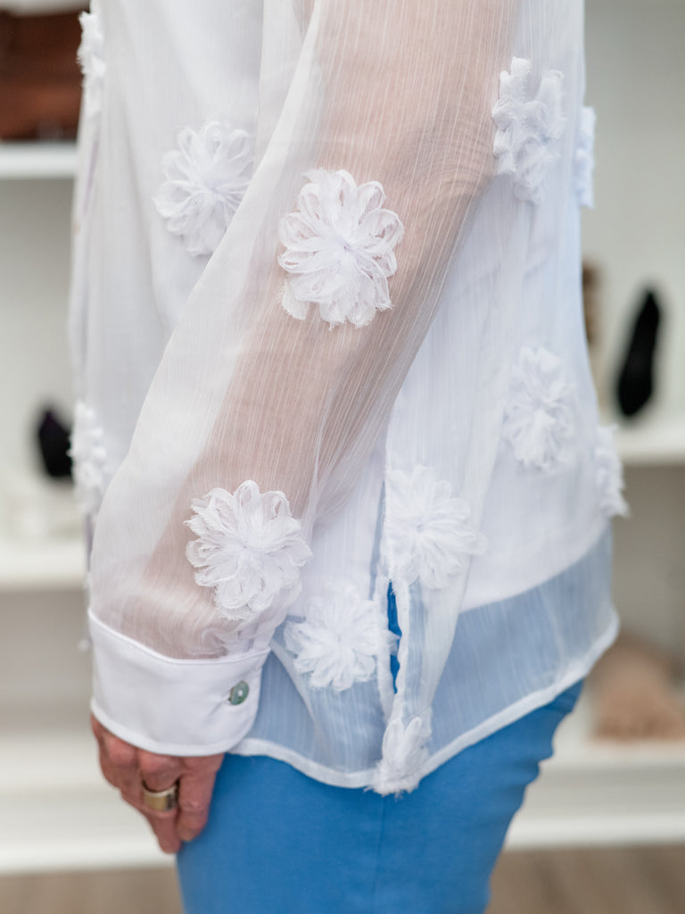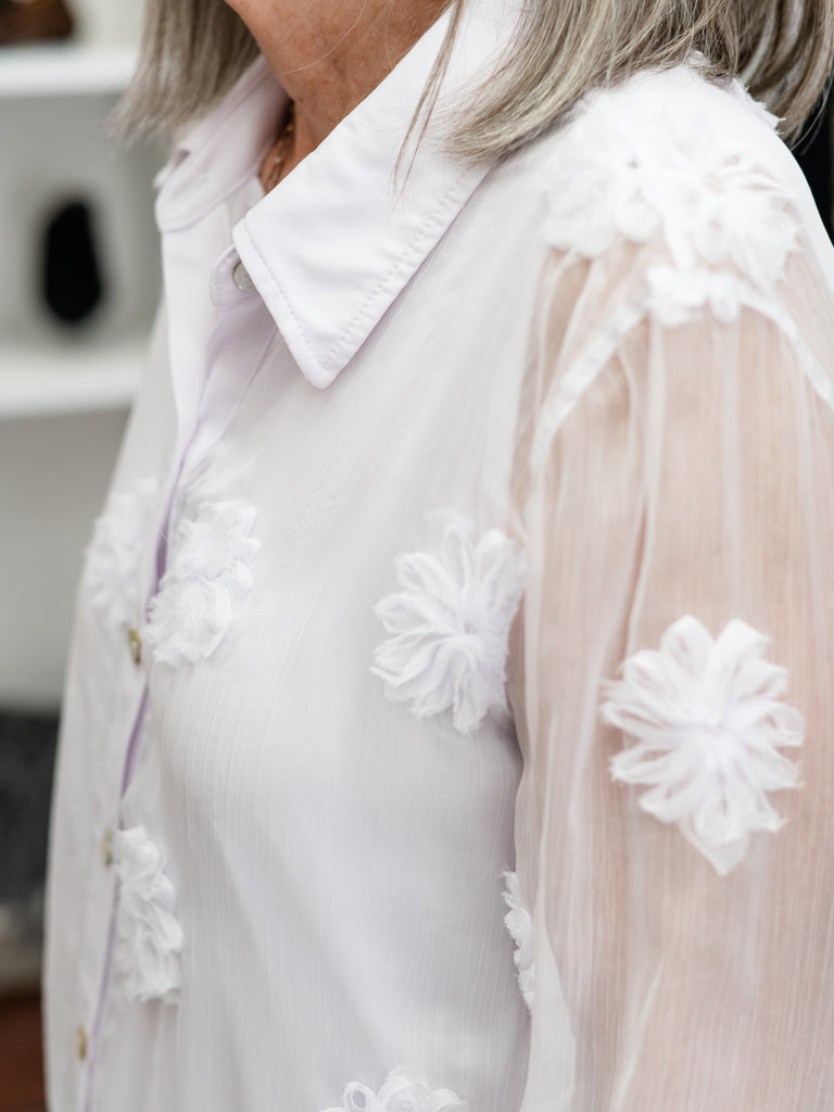 Delicate, feminine, and effortlessly chic — this sheer button-front blouse is a beautiful statement piece for any season. Designed in a lightweight, airy fabric, it features dimensional floral appliqués that add texture and elegance while maintaining a soft, sophisticated look.
