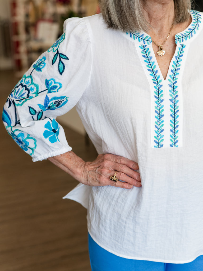 The split neckline is accented with intricate contrast embroidery for an eye-catching detail, while the long sleeves showcase vibrant floral embroidery that adds a pop of coastal-inspired color. Soft elastic cuffs create a subtle blouson effect, giving the top an easy, flattering shape whether worn loose or front-tucked.