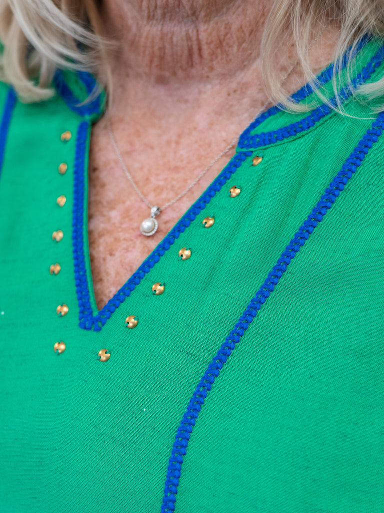 Fresh, vibrant, and effortlessly flattering, this stunning green blouse is the perfect way to add a pop of color to your wardrobe. Beautiful blue floral embroidery accents the sleeves while vertical contrast trim elongates the silhouette for a slimming, polished look. The split neckline is finished with delicate stud detailing for just the right touch of sparkle.