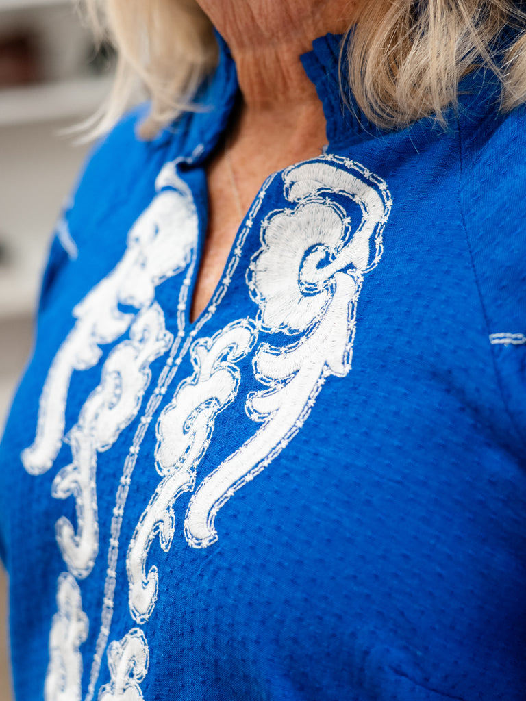Make a bold, beautiful statement in this vibrant blue embroidered top. Designed with eye-catching white scroll embroidery down the front and on the sleeves, this piece blends classic detailing with a fresh, modern silhouette. The split neckline with a soft ruffle collar adds a feminine touch, while the gently gathered puff sleeves create just the right amount of volume.