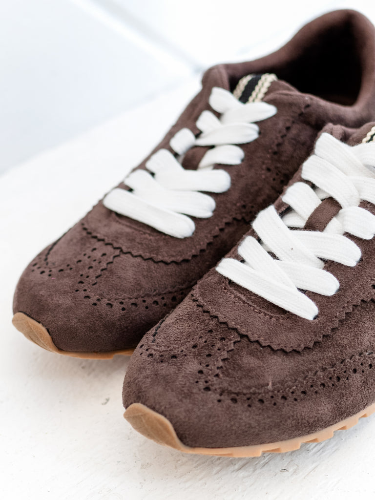 Retro charm, redefined. The PENELOPE sneaker in rich brown suede-texture brings a grounded, heritage feel to your wardrobe. With its brogue-style perforations, contrast laces, and low-profile silhouette, this style effortlessly blends sporty and sophisticated energy. Dress it up with tailored denim or keep it casual with wide-leg trousers-this one’s built for versatility.