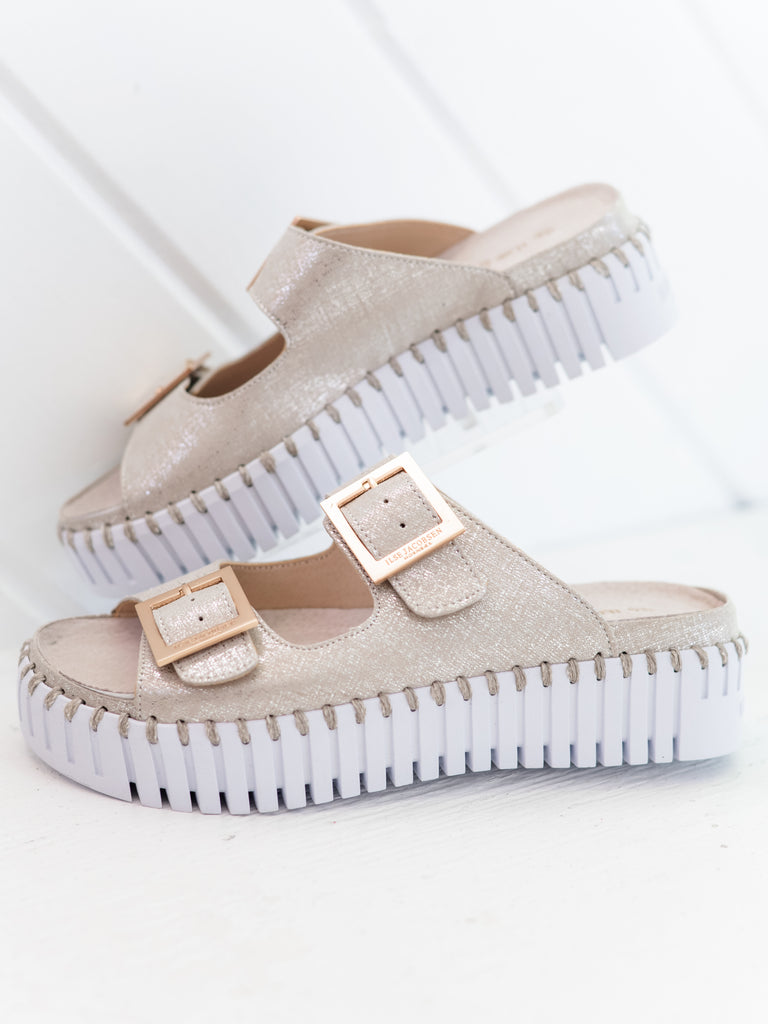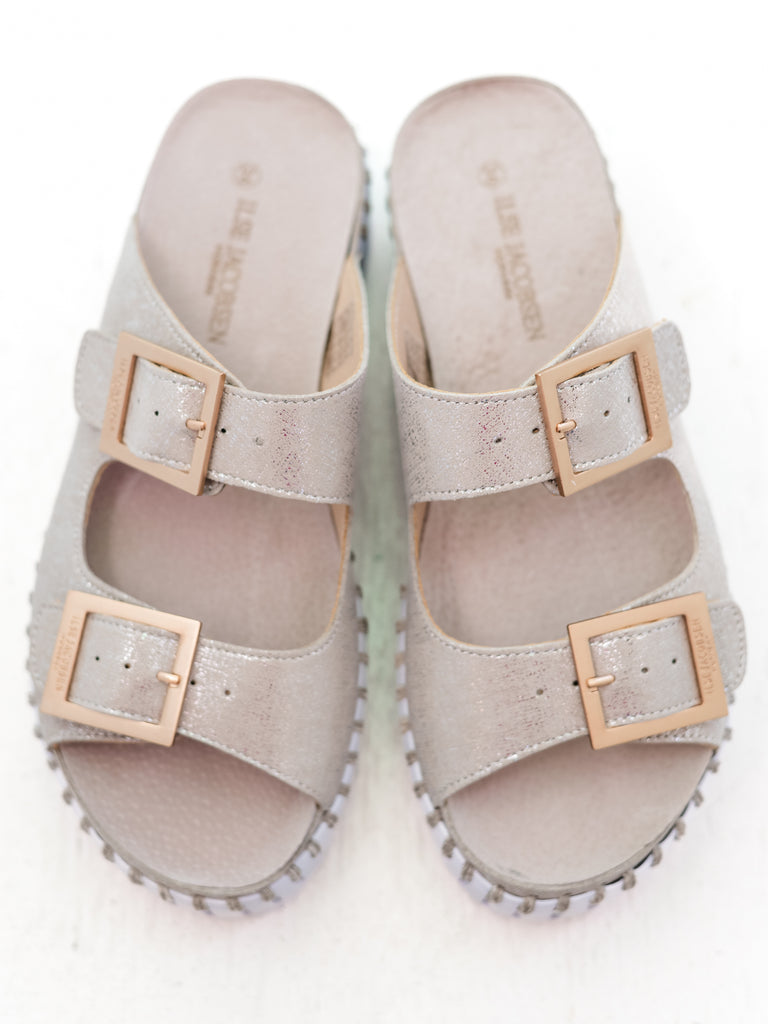 Modern, lightweight, and effortlessly stylish, the Tulip 1032 sandal by Ilse Jacobsen is designed for all-day comfort with a sleek, contemporary look. Crafted in a soft metallic beige finish, this sandal features two adjustable buckle straps that provide a secure, customized fit.