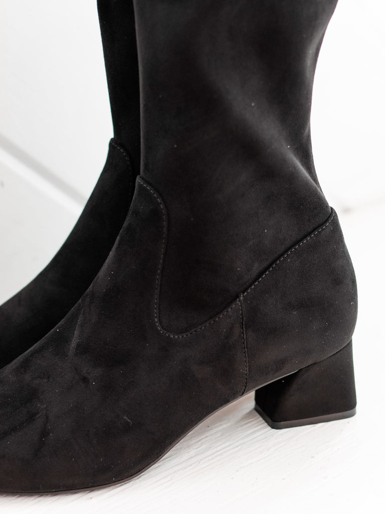 Sleek, streamlined, and endlessly versatile — this stretch suede knee-high boot brings elevated comfort to everyday style. Crafted with a soft, flexible suede that hugs the leg for a flattering fit, it features a classic almond toe and a full side zipper for easy wear. A padded insole and flexible rubber sole ensure cushioned support with every step, while the 1.75-inch covered heel adds just the right amount of lift.