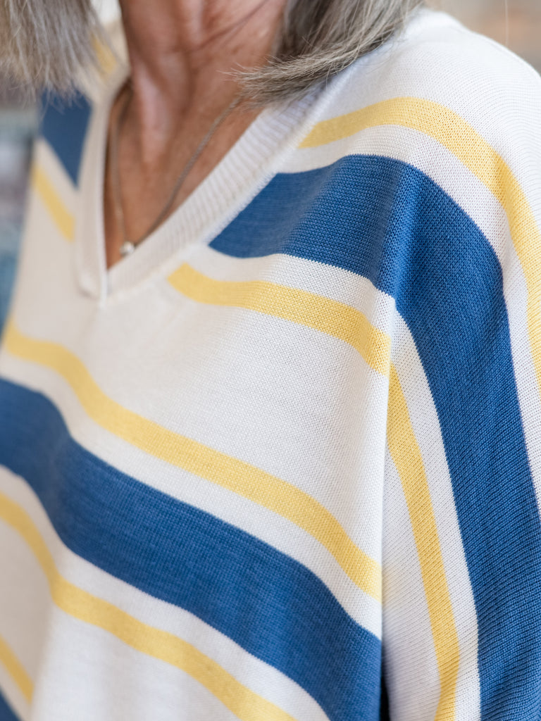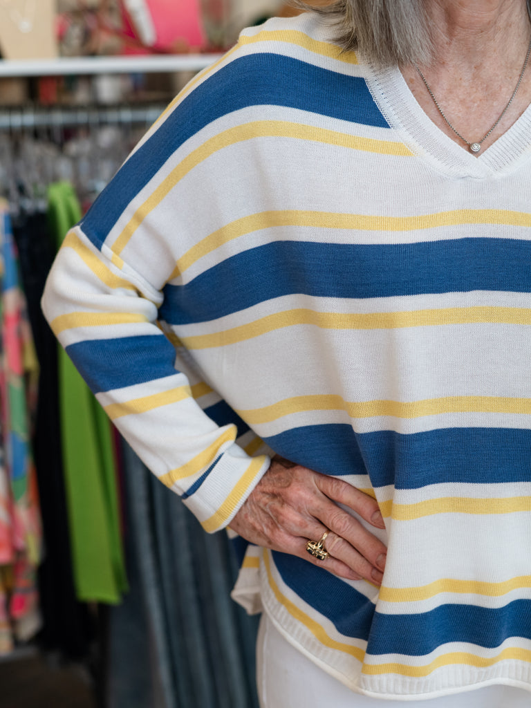 Easygoing and effortlessly stylish, this striped V-neck sweater is the perfect piece for relaxed, everyday wear. Featuring soft horizontal stripes in shades of blue and yellow on a creamy neutral background, it brings a fresh, coastal-inspired feel to your wardrobe.