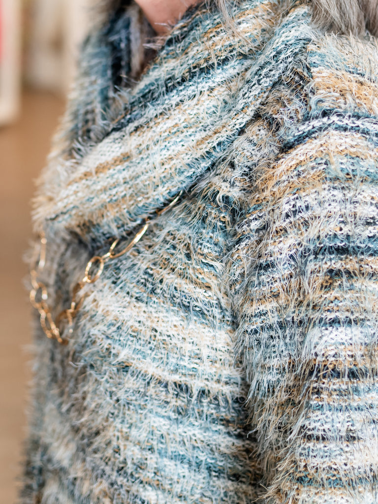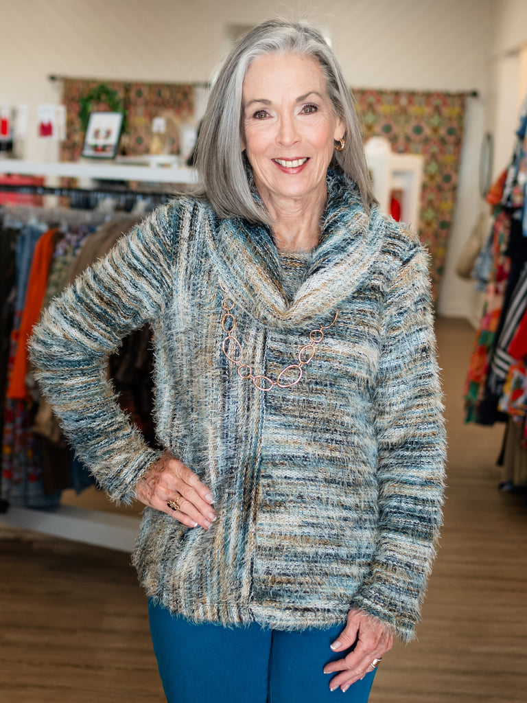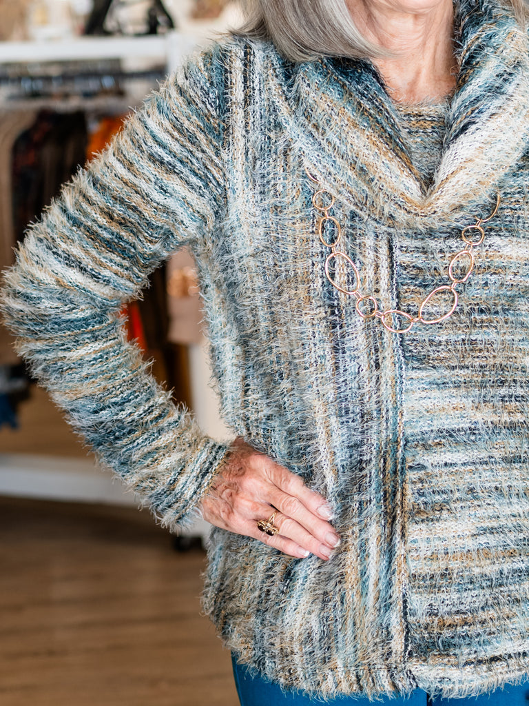 Wrap yourself in cloud-soft comfort with this striped feather yarn knit top. The cozy cowl collar and plush texture bring a touch of luxury to cooler days, while side seam vents add easy movement and a flattering drape. Perfect for pairing with denim or dressy bottoms alike, it’s the sweater that feels as good as it looks.