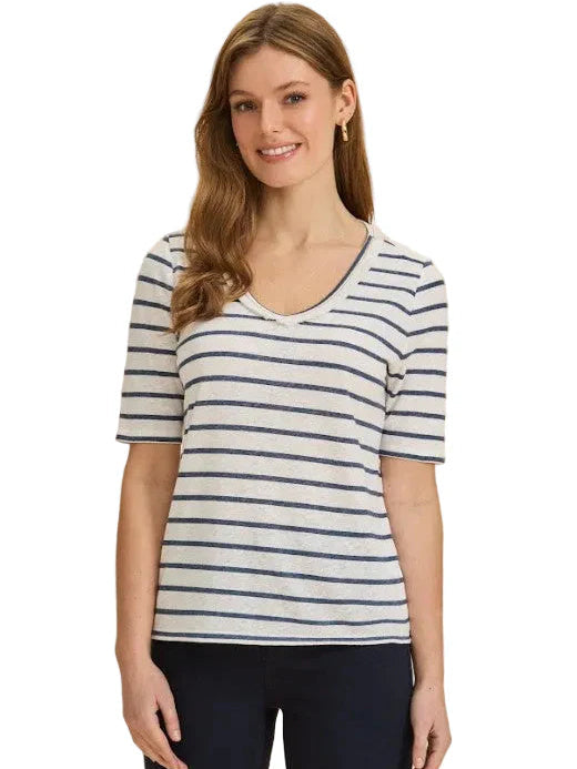Lightweight with beautiful texture, this short sleeve V-neck top is an easy blend of comfort and style. Crafted in a soft jersey knit burnout fabric, it features a fringed neckline accented with subtle gold beading for just the right touch of shine. The relaxed straight hem makes it effortless to wear tucked or untucked—perfect for everyday chic.