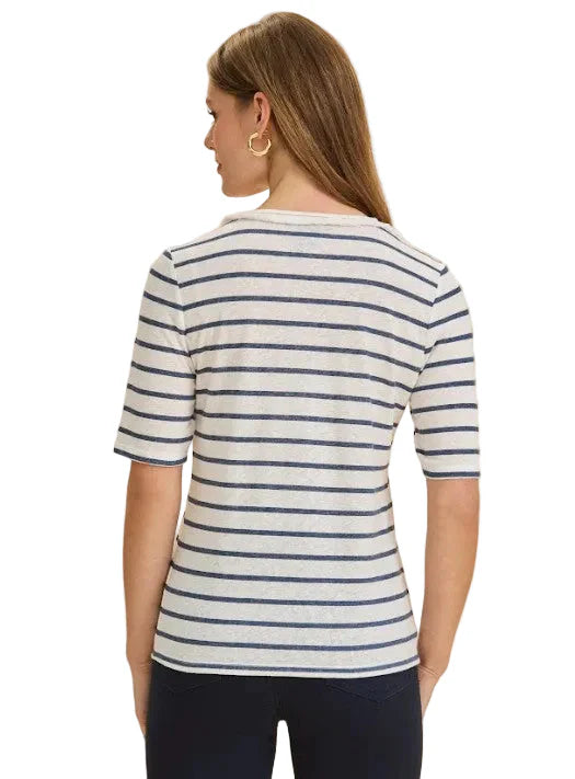 Elbow Sleeve Fringed Neck Top Navy by FDJ