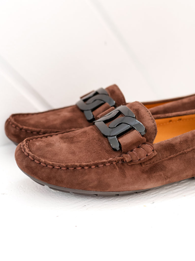 Ultra-soft glove leather moccasin. Matching chain accent. Padded leather insole. .25 inch rubber driving sole.