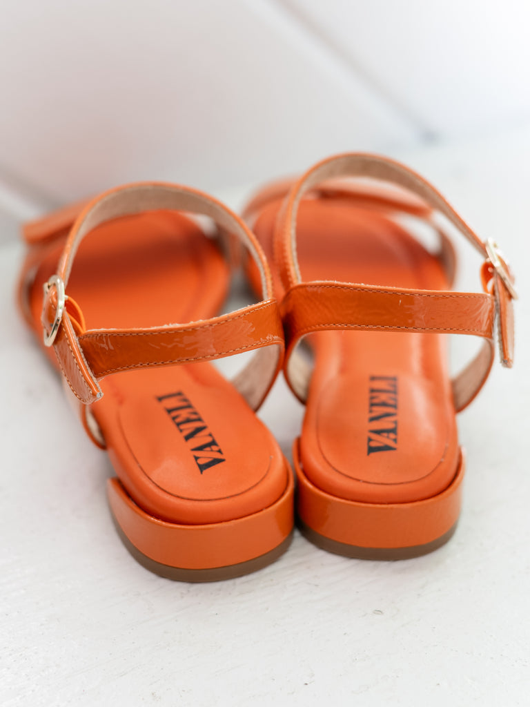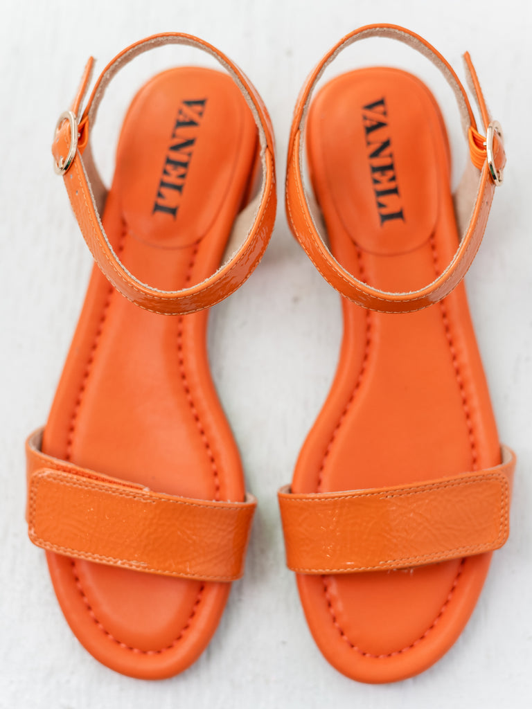 Bright, modern, and effortlessly chic, the Belia sandal by Vaneli adds a bold pop of color to your warm-weather wardrobe. Crafted in glossy Orange Naplak patent leather, this stylish sandal brings eye-catching shine and sophisticated simplicity to any outfit.