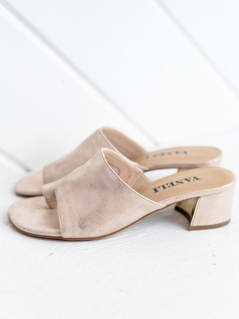 The wide, sleek upper offers a secure and flattering fit, while the subtle toe loop detail adds a unique touch. A low block heel with a hint of shine provides comfortable lift, making this sandal as practical as it is polished.