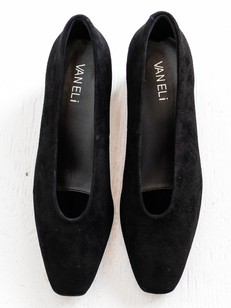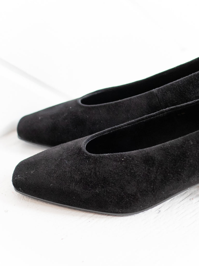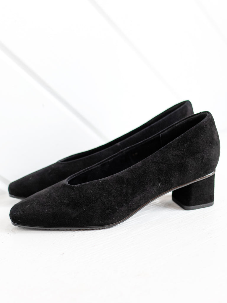 Suede pump with high-cut topline. Soft square toe. Padded insole. 1.5 inch covered block heel.